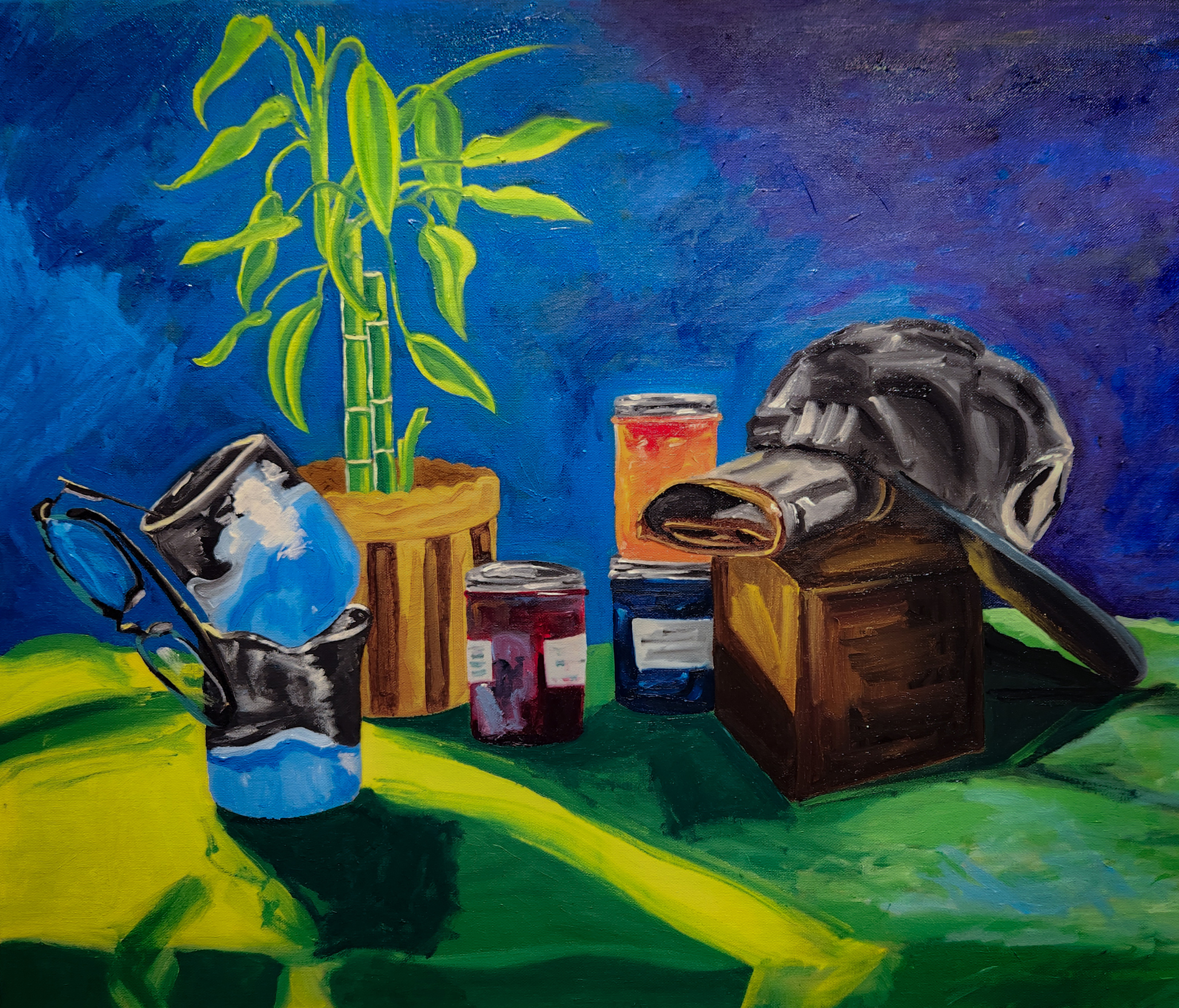 A Snapshot of Color is a still-life featuring objects imbued with personal significance, however, its significance extends beyond the objects themselves. The vibrant greens, blues, and purples are arranged at erratic yet strikingly sharp angles. The dramatic composition and deep perspective evoke the feeling of a fleeting moment—a memory frozen in time, seen through a singular, personal lens.